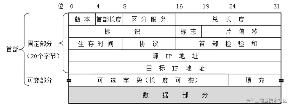网络包的首部至少有20个字节,因为首部还包含可变部分