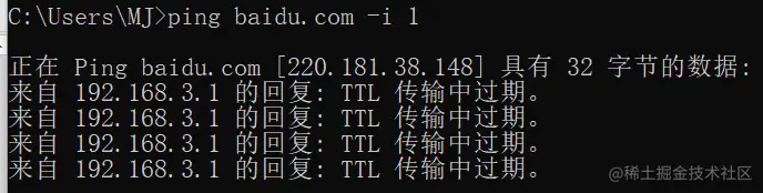 注意:如果因为TTL不够了而通信错误,则这个错误信息是由TTL减为0的那个路由器对应的网关返回的,如下图中,由下图中返回数据包的IP地址为192.168.3.1可知