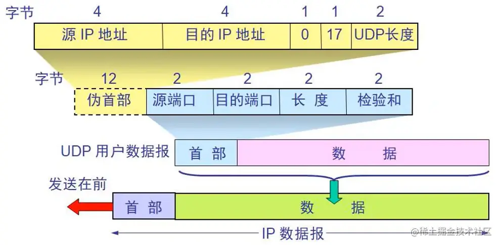伪首部 + 首部 + 数据- 伪首部:仅在计算检验和时起作用,并不会传递给网络层;这是协议栈规定的,为了增强我们的检验功能,其固定是1