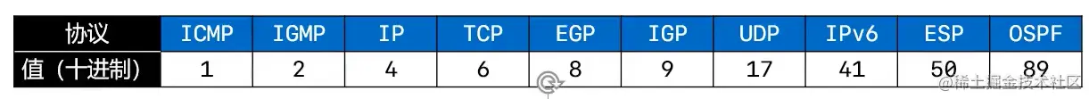 8个bit,1个字节 - 表明封装的数据(除去首部)使用的是什么协议