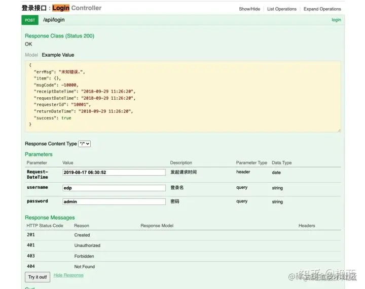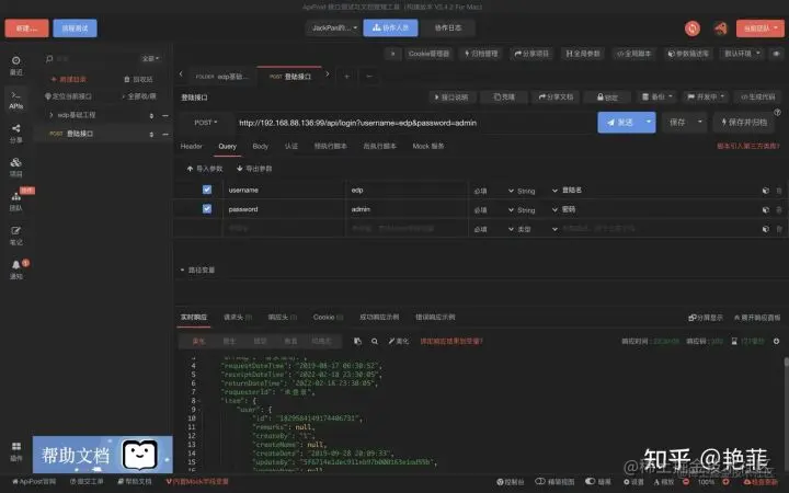 首先,我定义了一个很初级登陆的接口,然后我从Swagger中将我登陆接口的参数名,参数说明,以及参数类型等等复制一遍到ApiPost中,然后再将我的测试变量复制过去,然后点击发送请求。得到对应的响应结果。