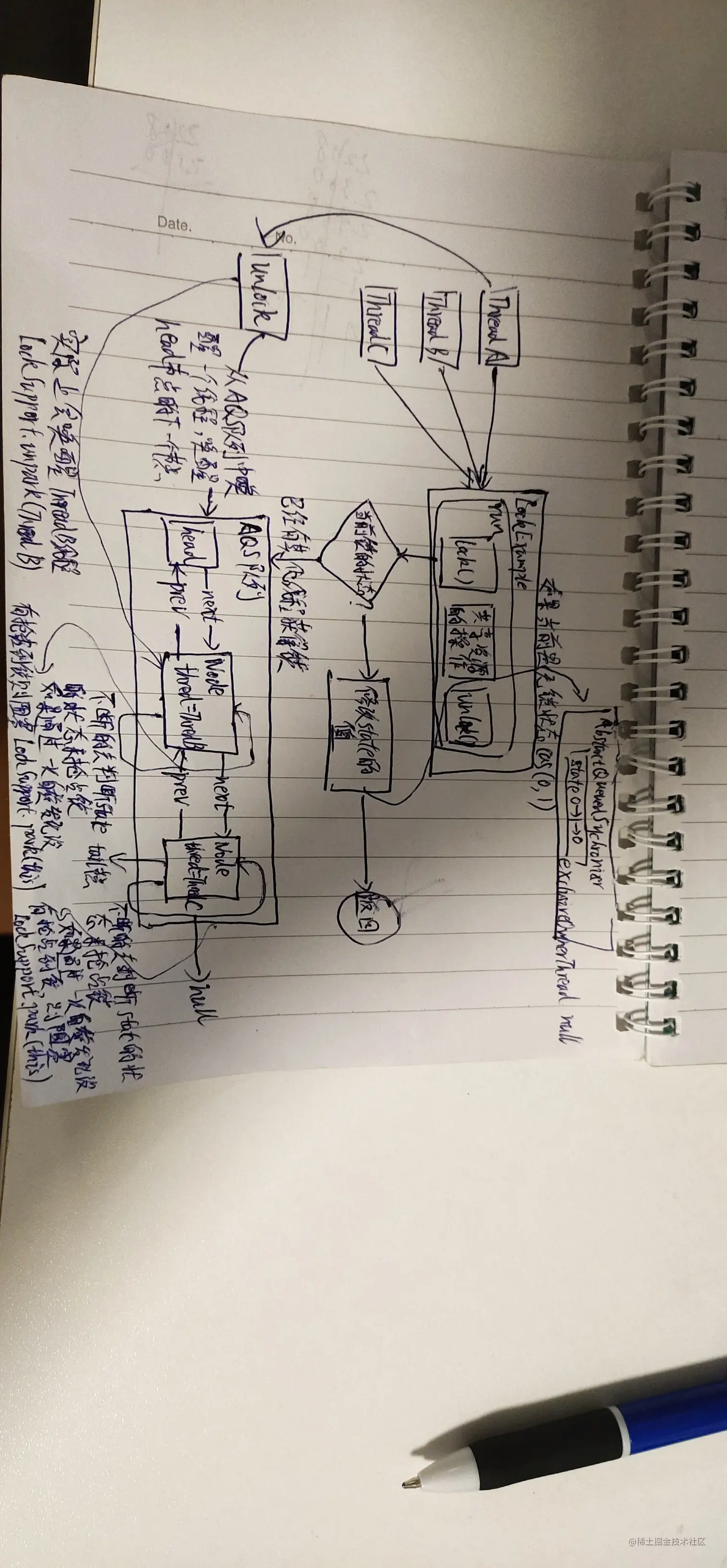 aqs是多线程同步器,它是JUC包中多个组件的底层实现,比如像Lock、CountDownLatch、Semaphore都用到aqs。从本质来来说,aqs提供了两种锁的机制,分别是排他锁和共享锁。所谓排他锁就是存在多个线程去竞争同一共享资源的时候,同一个时刻,只允许一个线程去访问这样一个共享资源,也就是说多个线程中只能有一个线程去获得这个锁的资源,比如Lock中的ReentrantLock重入锁,它的一个实现就是用到了aqs中一个排他锁的功能;共享锁也称为读锁,就是在同一个时刻允许多个线程同时获得这样一个锁的资源,比如CountDownLatch以及Semaphore都用到aqs中的共享锁的功能,那么aqs作为互斥锁来说,它的整个设计体系中需要解决三个核心的问题,第一个互斥变量的设计,以及如何保证多线程同事更新互斥变量的时候,线程的安全性,第二个,未竞争到锁资源的线程的等待以及竞争到锁的资源释放锁之后的唤醒,第三个锁竞争的公平性和非公平性,aqs采用了一个int类型的互斥变量”state”,用来记录锁竞争的一个状态,0表示当前没有任何线程竞争锁资源,而大于等于1,表示已经有线程正在持有锁资源,一个线程来获取锁资源的时候,首先判断”state”是否等于0,也就说它是无锁状态,如果是,则把这个”state”更新成1,表示占用到锁,而这个过程中,如果多个线程能同时去做这样一个操作,就到导致线程的安全性问题,因此aqs采用CAS机制去保证”state”互斥变量更新的一个原子性,未获得锁的线程,通过Unsafe类中的park方法去进行阻塞,把阻塞的线程按照先进先出的原则,去加入到一个双向链表的一个结构中,当获得锁资源的线程释放锁之后,会从这样一个一个双向链表的头部去唤醒下一个等待的线程,再去竞争锁。最后关于锁竞争的公平性和非公平性的问题,aqs的处理方法是在竞争锁资源的时候,公平锁需要去判断双向链表中是否有阻塞的线程,如果有呢,则需要去排队等待,而非公平锁的处理方式是不管双向链表中是否存在等待竞争锁的线程,它都会去直接尝试更改互斥变量”state”去竞争锁,假设在一个临界点,获得锁的线程释放锁,此时state等于0,而当前的这个线程去抢占锁的时候,正好可以把state修改成1,那么这个时候就表示它也可以拿到锁,而这个过程是非公平的。