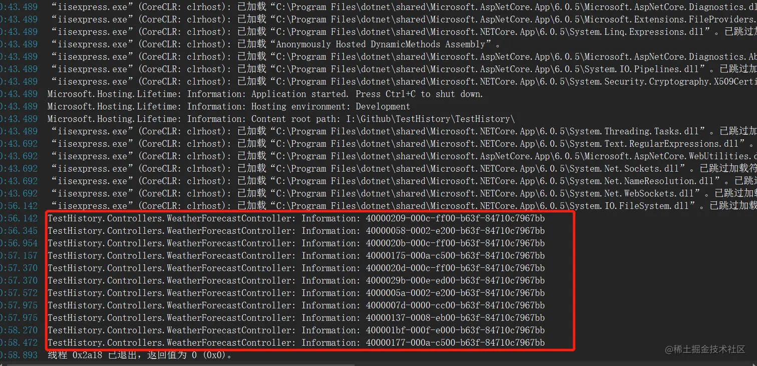 用上面的的程序,不做任何更改,在VS中IIS Express启动,调用几次接口,输出如下,由于没使用文件日志,IIS Express启动时没有窗口可以看输出,只能通过VS的调试窗口查看输出如下: