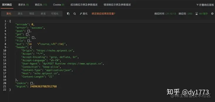 你可以查看返回数据,返回Header、Cookie、状态码、请求时长等等数据。
