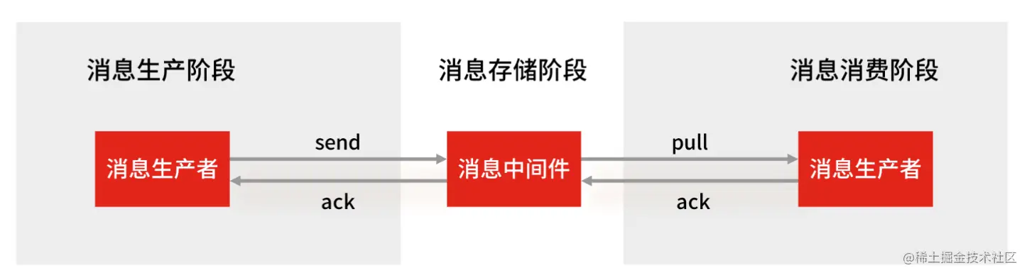 要解决「如何保证消息不会丢失」问题,首先要知道哪些环节可能造成消息丢失。一个消息从产生到消费的过程如下图所示,共3个阶段。所以,消息丢失可能出现在