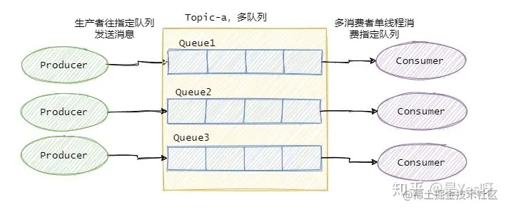 - 只能由一个生产者向 Topic 发送消息,并且一个 Topic 内部只能有一个队列(分区)