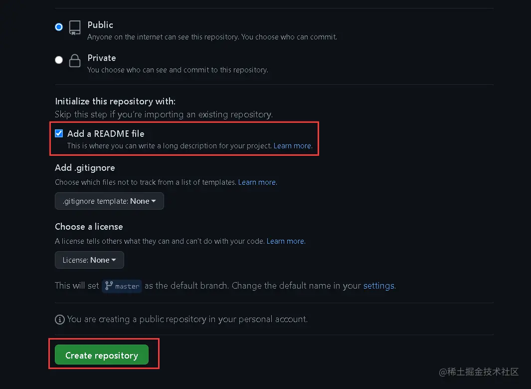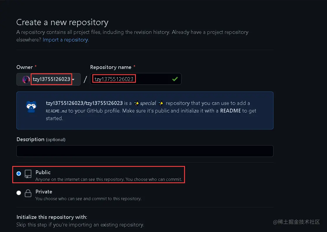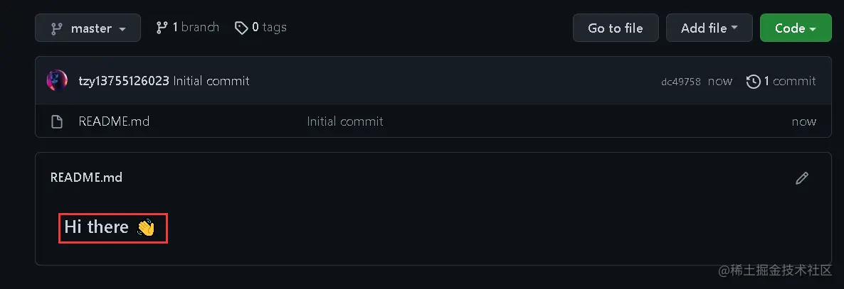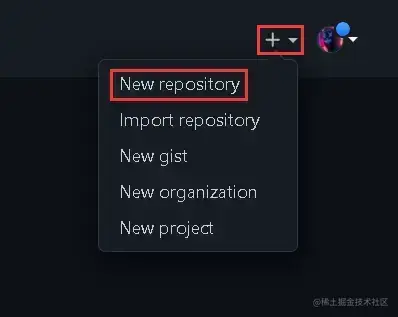 +按钮,选择New repository,创建和自己github用户名相同的仓库 - 创建完成,默认的README.md有一句话:Hi there 👋 。