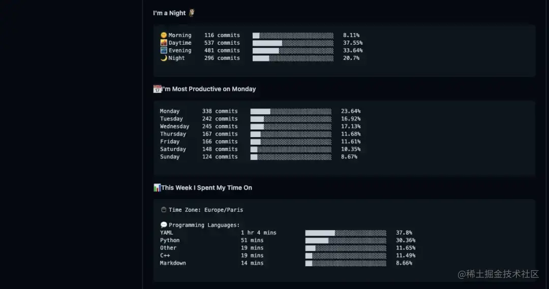 - 代码模式👨🏽💻:展示自己最近的code内容,code语言和开发时间。