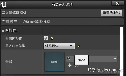 导入上面生成的 fbx 文件时把它导入为 骨骼网格体,因为在 Niagara 的 API 上骨骼网格体可以读取到更多信息。