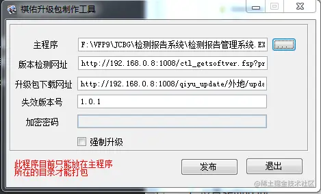 设置setting.ini softname=你的exe名字(不能错) Update_url 为升级版本号获取网址 Update_pack 升级包下载地址