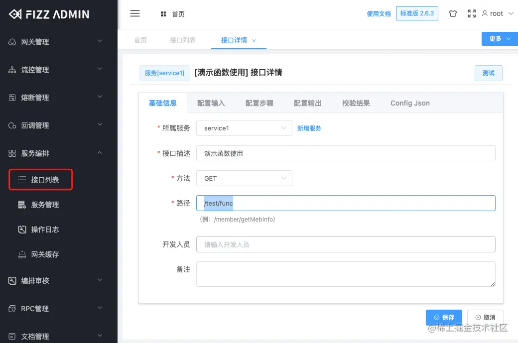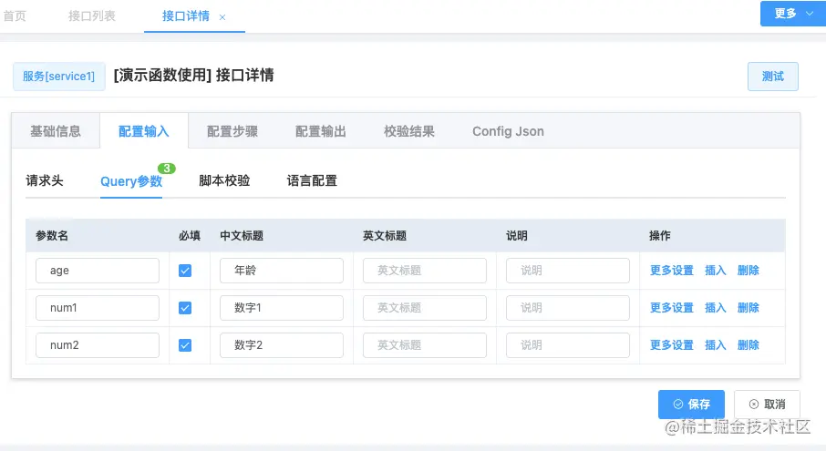 在菜单:服务编排->接口列表下新增一个演示用的服务编排接口/test/func,接口挂在service1服务下(没有服务可以新增一个),定义三个入参, 分别是num1,num2两个数字用于演示数字比较,age年龄用于演示根据年龄做判断,因为该例子不涉及到外部接口调用"配置步骤“可留空。如图: