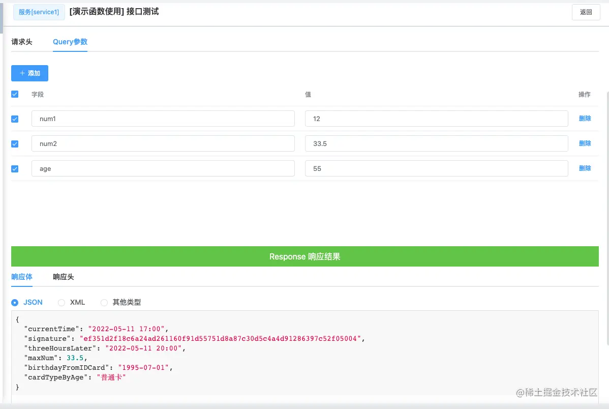点击右上角的测试按钮进入到测试页面,填写Query参数,点击发送可得到结果:
