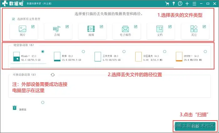 第2步:选择丢失的文件类型以及丢失文件的存储位置,首次使用推荐选择全部文件类型,文件位置是文件丢失之前的路径,选择完成后开始“扫描”;