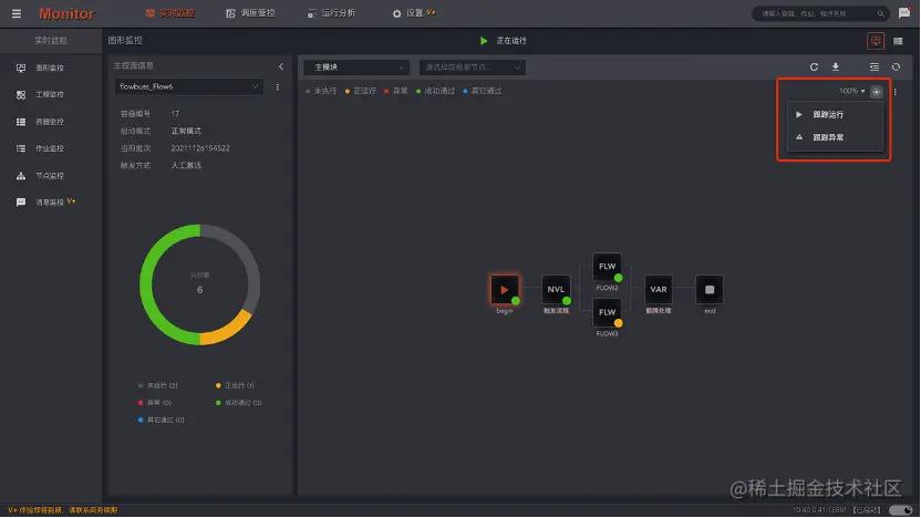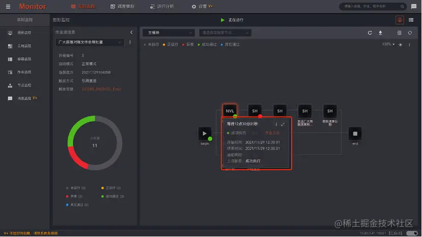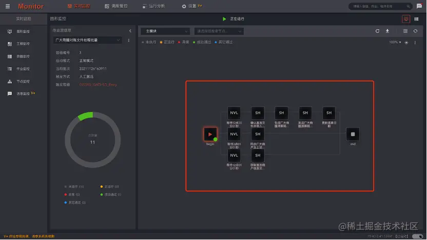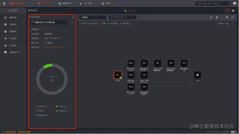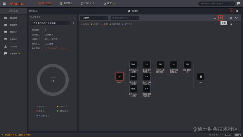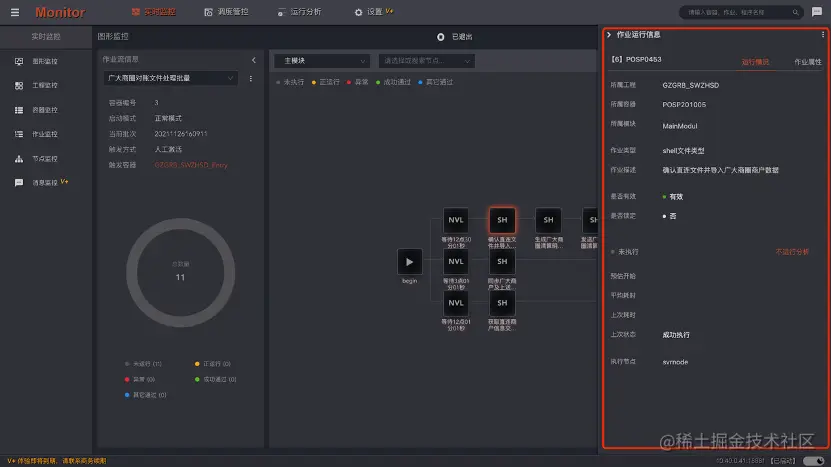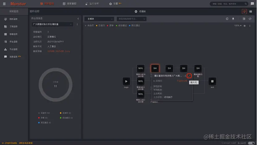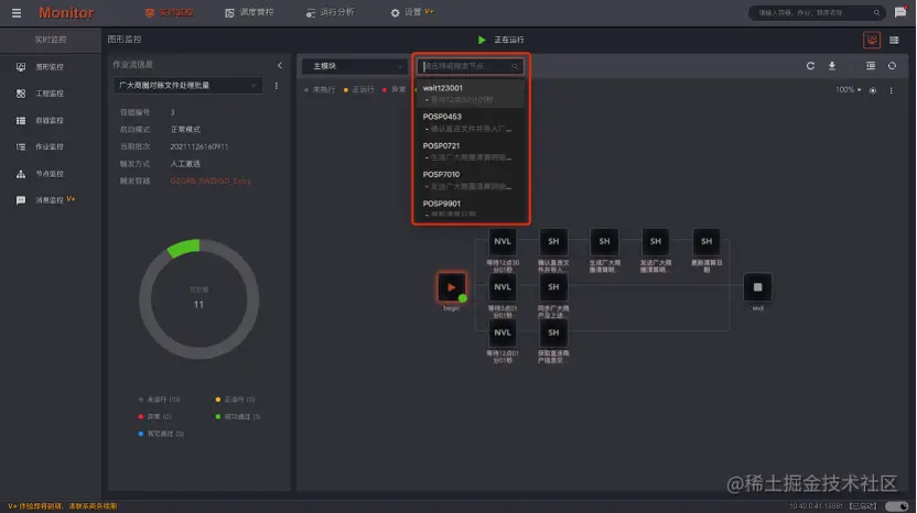 **8. 正执行作业节点快速定位:**在作业容器运行过程中,往往对正执行及异常的作业最为关注。但作业节点的状态不停改变,如果长时间不关注页面将失去监控焦点。