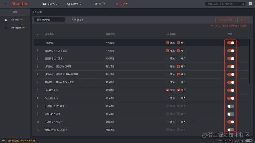 个性化订阅平台内需要接收的消息种类。订阅按钮打开后,才能在平台中收到该消息种类。推送渠道对应了平台管理 - Admin中设置的用户手机号码和邮箱地址。配置好平台的短信或邮件接口后,平台消息才会推送到对应的渠道。