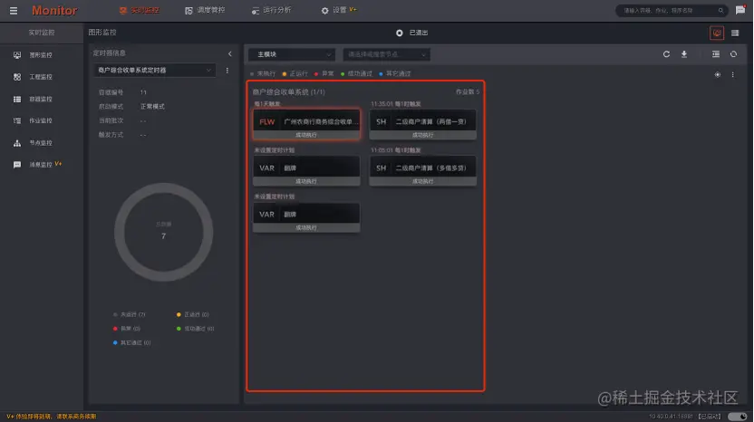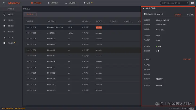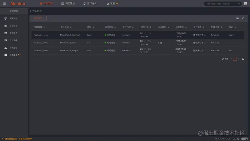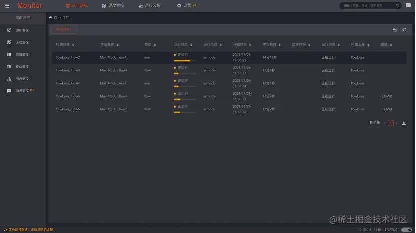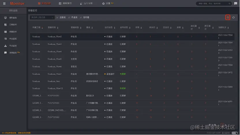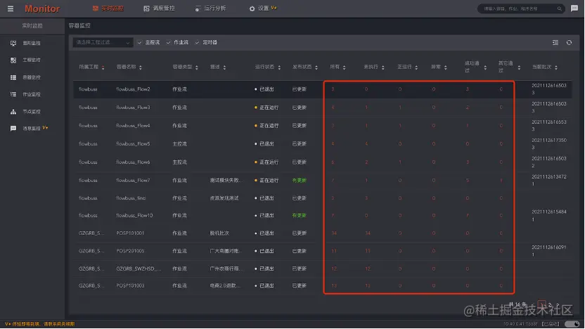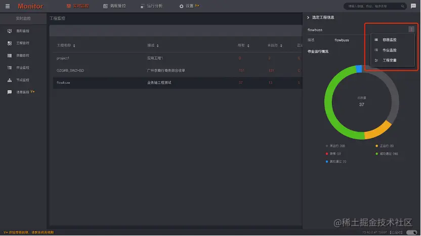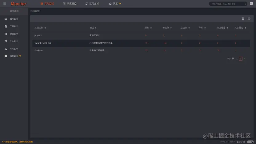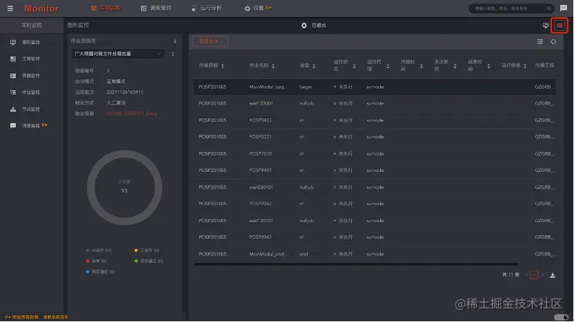 工程监控是以“应用工程”为口径,以作业运行状态为切面。实时统计每个“应用工程”下,作业不同执行状态的数量和汇总情况,是最上层次的统计方式。