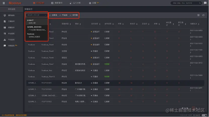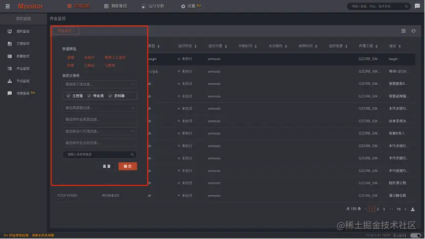作业监控以列表形式展示了作业实时运行状态的详细信息。包括作业动态的运行信息和静态的基本信息。工具栏的“筛选条件”提供了多种条件过滤方式:快速条件,应用工程、作业容器及类型、作业类型、运行代理、以及运行状态。