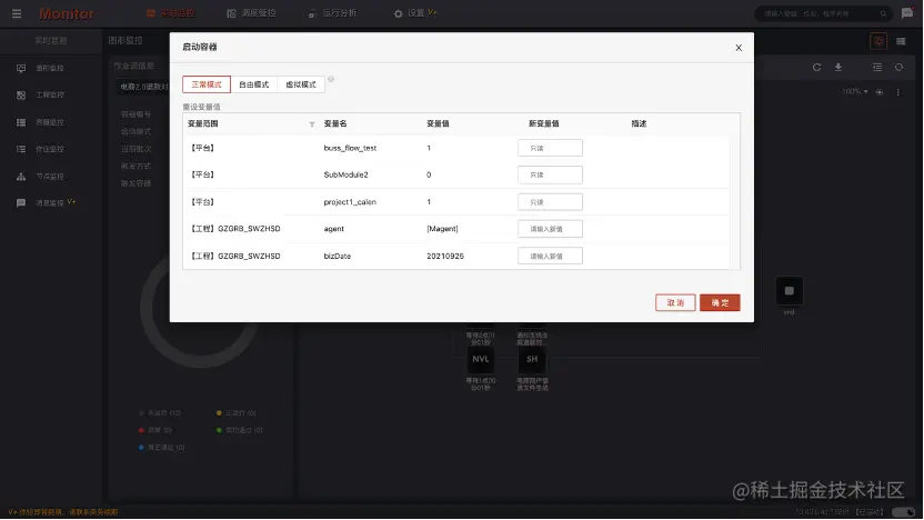 虚拟模式:虚拟模式启动的作业容器,不会真实运行作业,仅模拟运行情况。可以选择虚拟运行的速度倍率。
