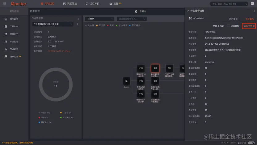 静态基本属性包括作业的执行计划,条件,容错,循环等调度策略属性。还包括引用的参数和作业的代码块。点击链接“去设计作业”,能够方便从监控环境Monitor跳转到设计环境Designer的作业位置。