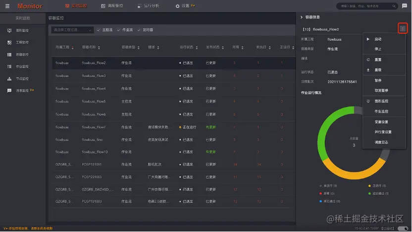 作业容器信息面板提供了作业容器快速切换选择组件和作业容器的命令菜单。还展示了当前选定的作业容器基本信息,运行信息、状态信息。采用圆环图展示了作业运行状态数量、比例统计信息。