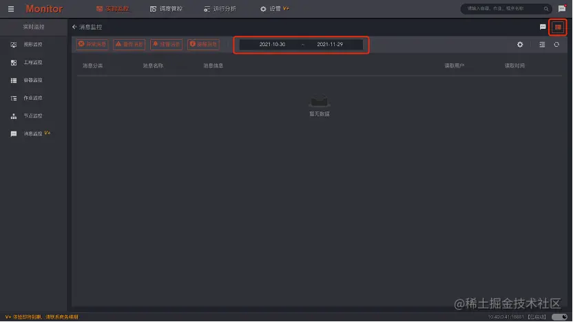 消息监控以消息种类分组的形式展示了当前用户订阅的平台消息。在工具栏中按照消息分类筛选显示的消息。每一种消息有独特的批量操作命令,例如:当接收到多条作业失败的消息,在作业失败消息种类分组上执行批量跳过或重试的命令。