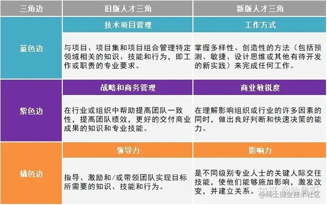 从新版的人才三角可以看到,对于项目经理的要求有有更高的要求,不在单单的注重自身的提升,而是在自己的提升的过程中还要能够带领团队,影响团队一起提升。