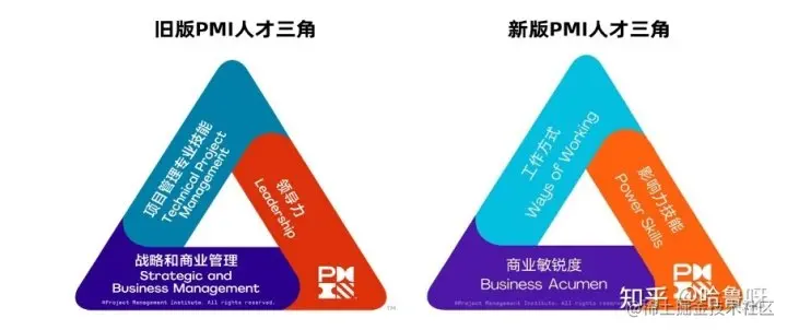 旧版PMI人才三角:包括项目管理专业技能、战略和商业管理、领导力;