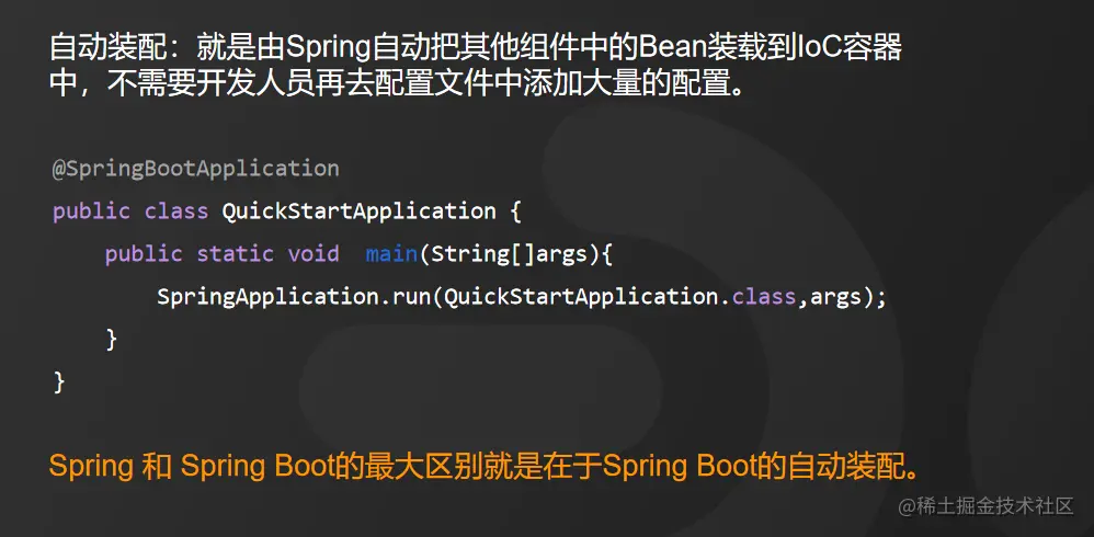 自动装配就是由Spring自动把其他组件中的Bean装载到IoC容器中,不需要开发人员再去配置文件中添加大量的配置。我们只需要在Spring Boot的启动类上添加 @SpringBootApplication 注解,开启自动装配。