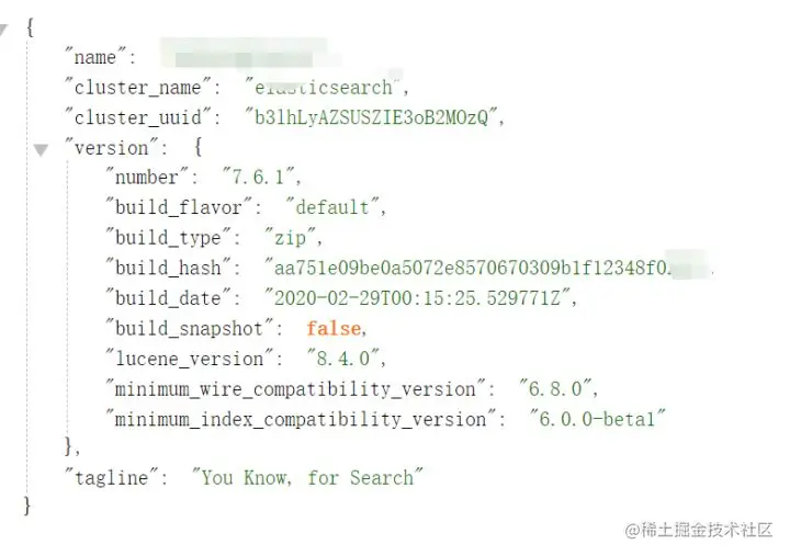 - 待启动后在浏览器上输入localhost:9200,展示如下图即安装成功