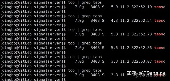 在业务运行期间,taosd的%CPU只有4%上下浮动,进程使用的物理内存百分比为11.2%。虽然内存占用稍多,但这是由于我们的vnode配置的比较多,每个vnode都有自己固定的内存缓冲区。因此,后续即便是继续大量增加新表或者加大写入量,内存占用也不会有明显的浮动了。