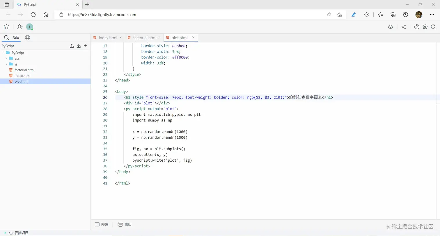 这个代码会直接关联到 PyScript 官网相应的代码库,当然你也可以直接下载源代码,然后同样以 .css 和 .js 文件的形式导入 HTML 项目中。