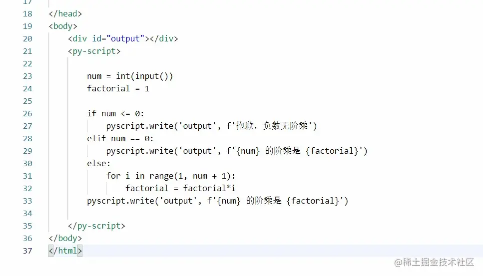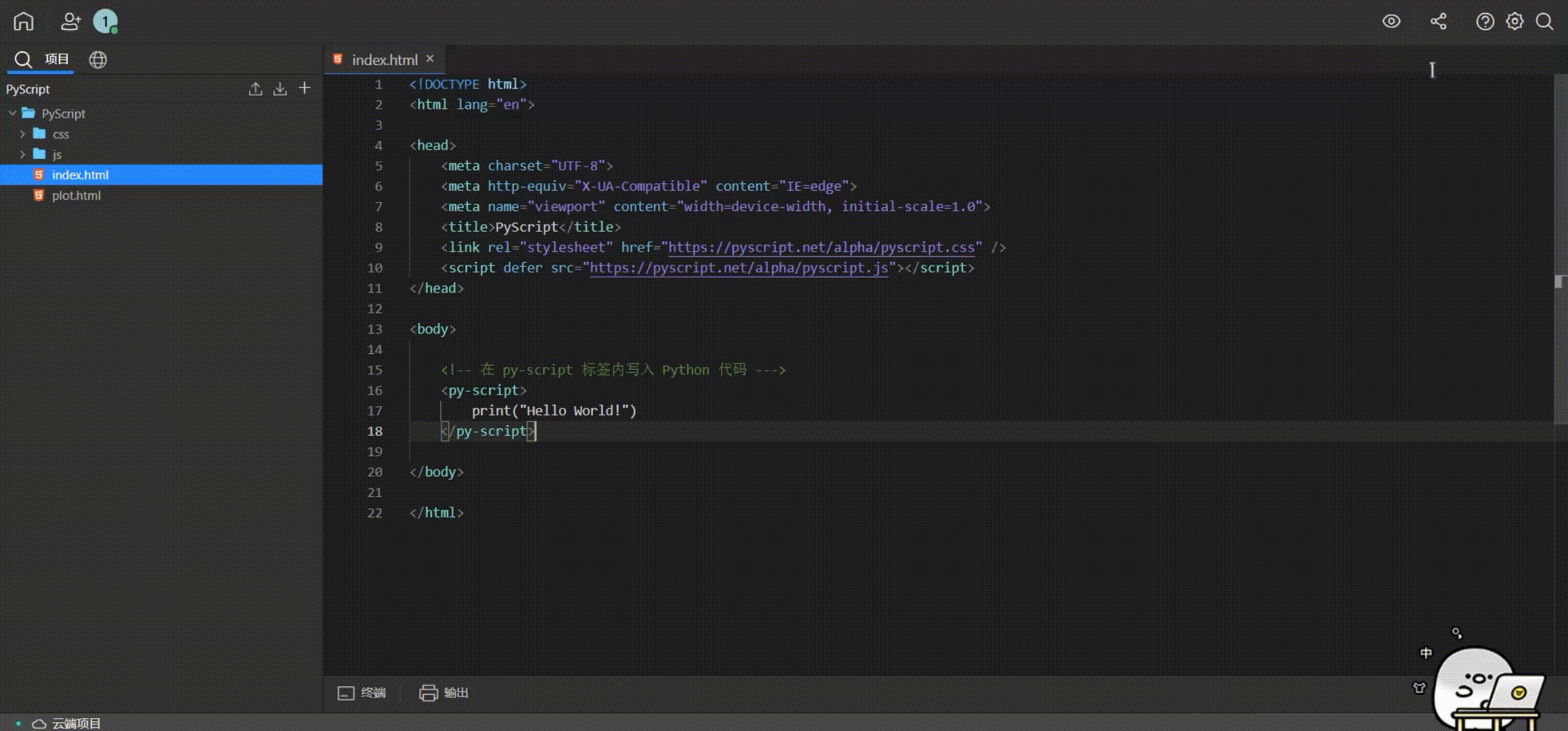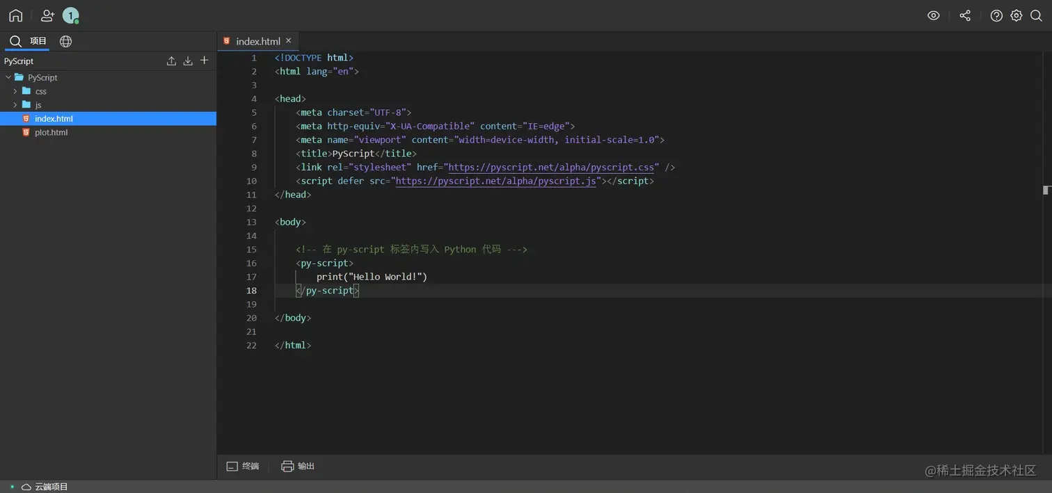 刚开始使用肯定要先来个经典的 “Hello World” 过把瘾,加上 <head> 标签就简单十几行代码,注意写入 Python 代码前后需要带 <py-script> 标签: