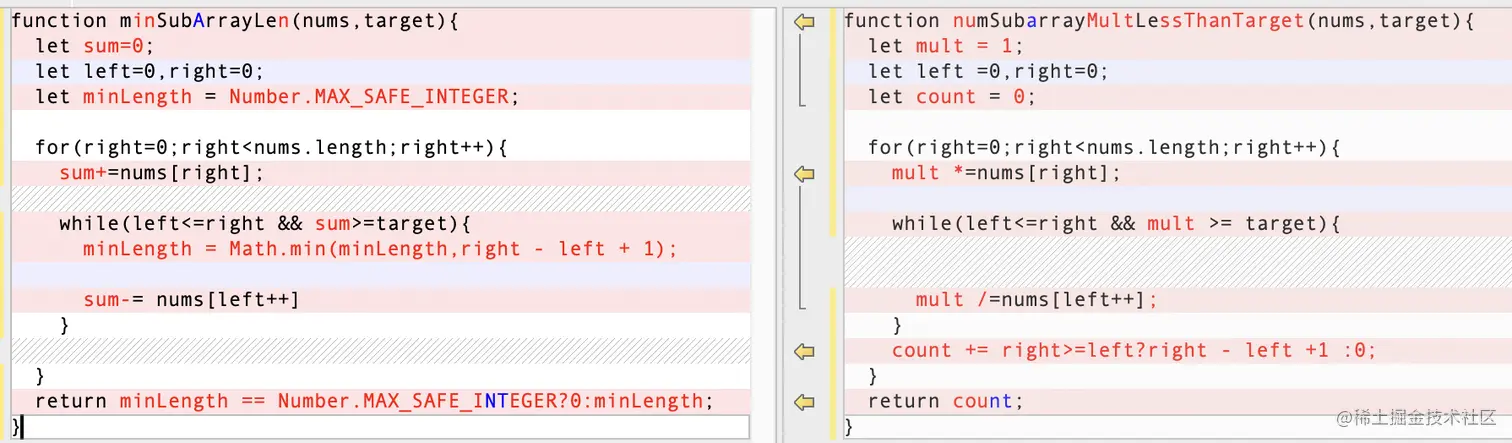 如果两个指针之间的子数组的sum或者mult与target之间关系如下:sum/mult<target: 右移right(right++),在子数组右边增加新的数字sum/mult>target: 右移left(left++),删除子数组最左边的数字