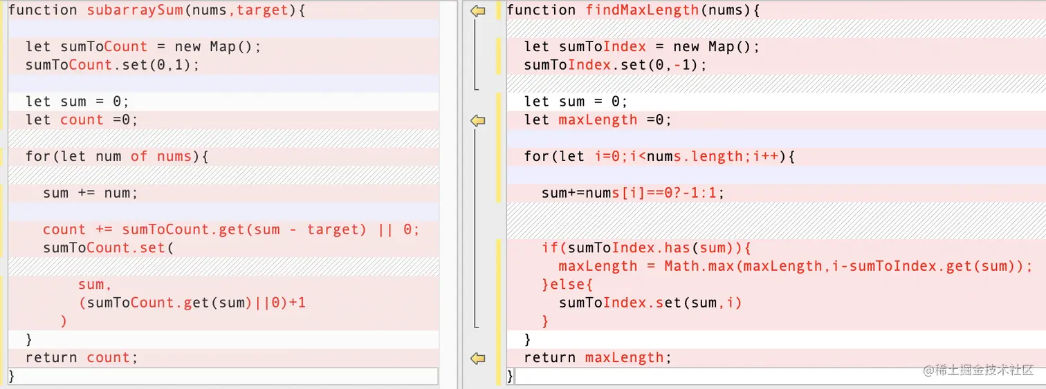 我们可以看到,在和为target的子数组和0和1个数相同的子数组中,虽然有些细节是不一样的,但是总体框架还是一致的。
