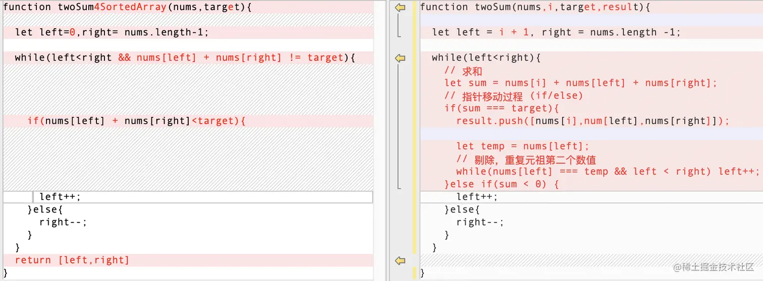 一个指针P1(left)指向数组的第一个数字,另一个指针P2(right)指向数组的最后一个数字,然后比较两个指针指向的数字之和(sum)与一个目标值(target)直接的大小关系。sum<target: 右移left(left++)sum>target: 左移right(right--)