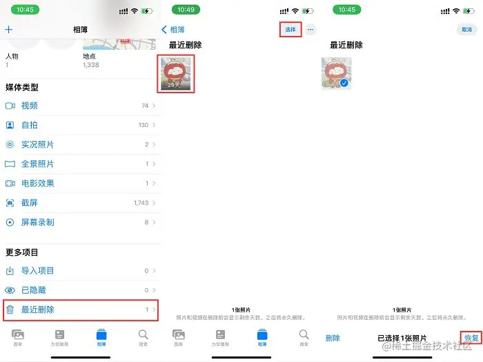 方法一:相册“回收站”恢复删除的图片