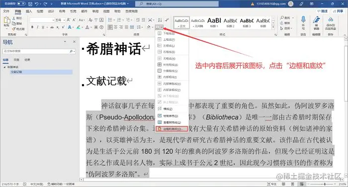 第1步:一样选中需要设置底纹的内容,不过这次需要点击的是另一个图标,也是在【开始】下方,如图展开这个图标后,点击“边框与底纹”:
