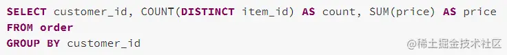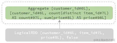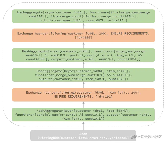 Within the same partition (there is no reshuffle between the second and the third stage), the output rows of the second stage are grouped by customer_id only, and the aggregation is conducted to both the distinct aggregation (Count(item_id) ) and the non-distinct aggregation (Sum(price) ).