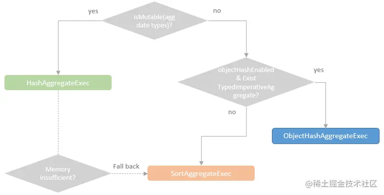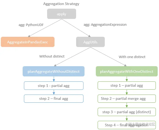 If the aggregation expression is an instance of AggregateExpression class, the “Aggregation” strategy checks whether or not this aggregation expression contains the Distinct aggregate function, e.g. COUNT(DISTINCT name). The “Aggregation” strategy then plans the physical execution accordingly.