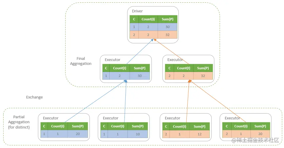The Spark implementation of the Distinct aggregation is a bit more complex that involves four aggregation stages and two shuffle operations. Let’s make two small changes to the query we used earlier. Instead of COUNT(item_id) , we add a DISTINCT operator and make it as COUNT(DISTINCT item_id). In addition, we add another aggregation expression, SUM(price) .