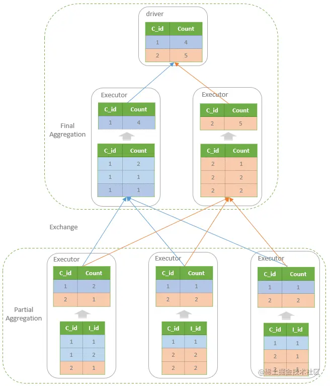 As the diagram shows, at the first “partial” aggregation stage, each partition of the RDD is grouped by the customer_id with the outputs of the count of the item_id for each customer within that partition. Then, the outputs of the first “partial” aggregation stage will be shuffled by the customer_id, i.e. the RDD is repartitioned so that the rows with the same customer_id will be placed in the same partition and executed in the same Spark executor. The second “final” aggregation then adds up all the item_id count for each customer and return the final results to the driver.