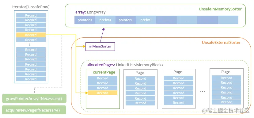 The UnsafeExternalSorter maintains a UnsafeInMemorySorter which holds an LongArray instance with the pointer and prefix for each stored record. The UnsafeExternalSorter provides a insertRecord method to write the record pointer and the key prefix and a getSortedIterator method for returning an iterator over record pointers in sorted order.