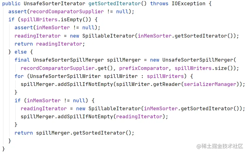 The getSortedIterator of the UnsafeExternalSorter returns the iterator of the sorted records to the UnsafeExternalRowSorter, which then relay the results to SortExec for output. Two scenarios covered in this getSortedIterator. If there is no spill, the result of the getSortedIterator of the UnsafeInMemorySorter will be wrapped in a SpillableIterator object and returns. If there are spills, an UnsafeSortedSpillMerger instance is created to merge all the spills in which the records are already sorted when the spill happened. The UnsafeSortedSpillMerger also merges the records currently pointed by the UnsafeInMemorySorter.