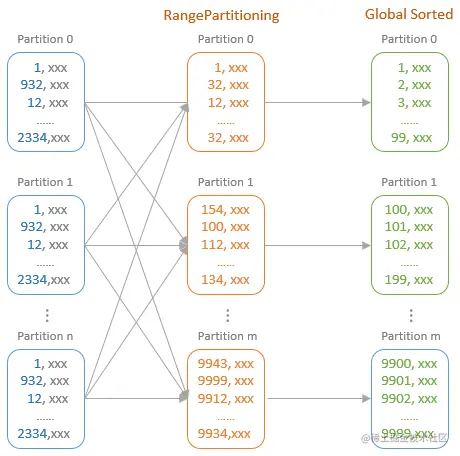 As the diagram shows below, for a global sorting operation, the partitions of the input dataset is reshuffled into RangePartitioning where all the rows in a partition are larger than any row in the partition in front of it. The SortExec operator then sorts the rows within each partition. As the partitions are sorted and the rows in a partition are sorted, the collection of partitions in order will return a global sorted dataset.