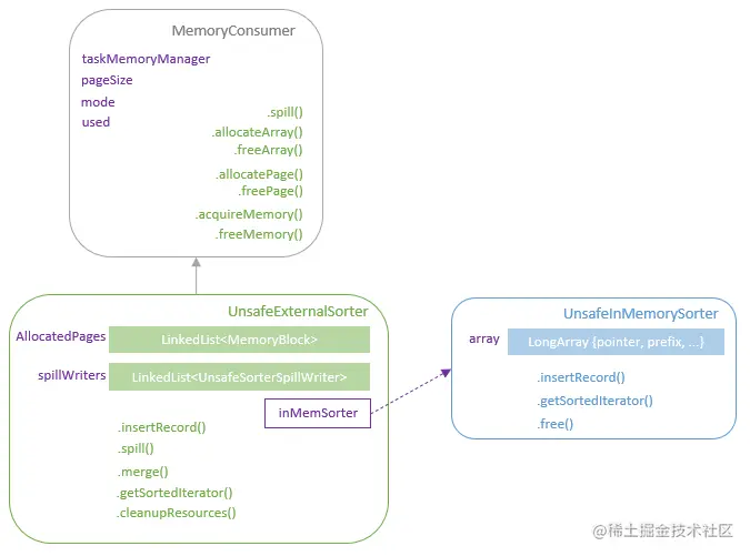 As mentioned earlier, an UnsafeExternalSorter is an implementation of the MemoryConsumer, which encapsulates the functionalities of task memory management such as allocate, free, and spill.