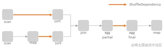 Now let’s look into how those stages are created and executed under the hood. At the core, the DAGScheduler traverses the RDD pipeline bottom up and creates stages recursively. The diagram below shows a simplified version of the RDD pipeline of our example query. The arrows highlighted in red represents the shuffle dependencies.