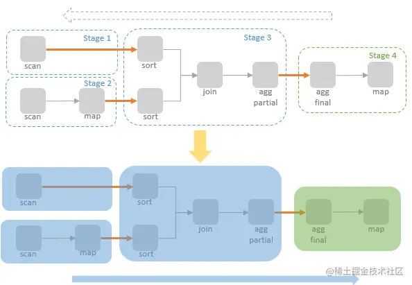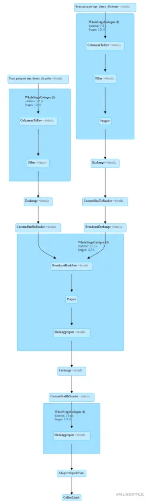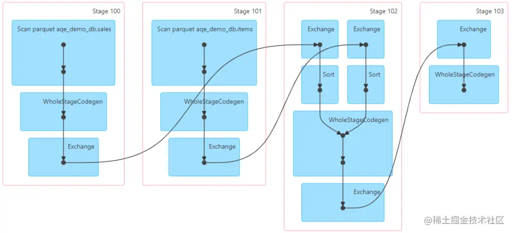 This is the DAG built from this query. As you can see, the query execution is separated into four stages: The first two stages read data from data files; the third one joins the two tables and conduct the partial aggregation; the last one, result stage, conduct the final aggregation and project the results.