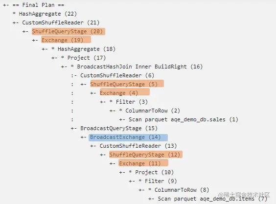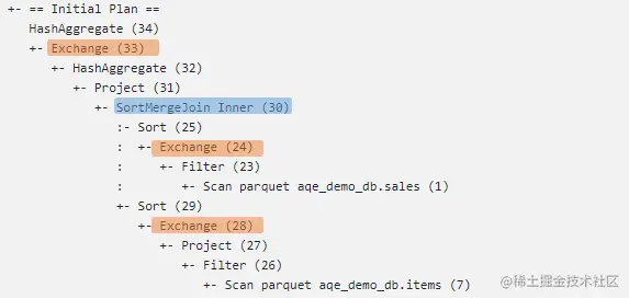 When AQE is enabled, the EXPLAIN command prints two physical plans, the initial plan and the final plan. The initial plan is the first version of the physical plan generated through the Spark Catalyst optimizer without any adjustments yet. As you can see, the initial version selects the sort-merge join algorithm, which is same as the physical plan generated when AQE is off.