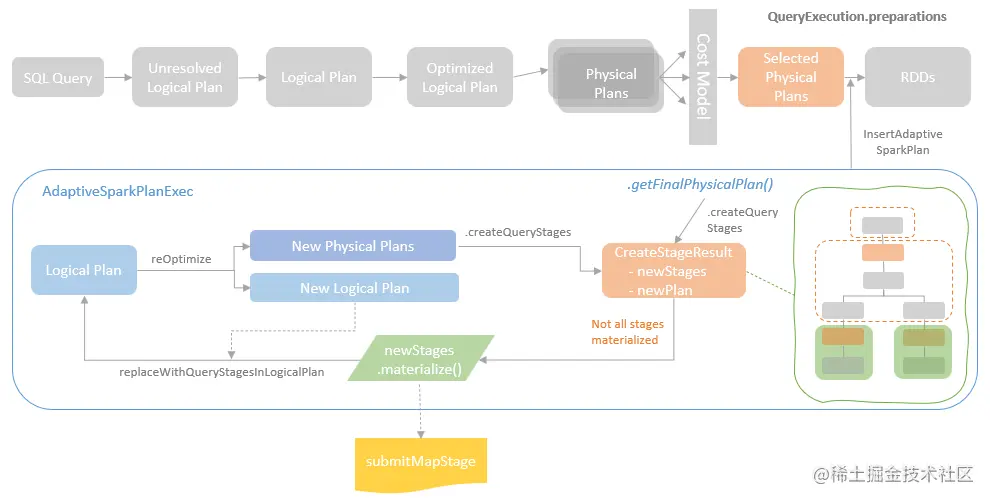 The new stage returned by the createQueryStages method is then materialised, which internally submits the stage to DAGScheduler to run independently and returns the map output statistics of the stage execution. The query plan is then re-optimised and re-planned based on the new statistics. The cost of the newly planed physical plan is then evaluated (by an implementation of the CostEvaluator) and compared to the cost of the old physical plan. If the new physical plan is cheaper to run than the old one, use the new physical plan for the remaining processing.
