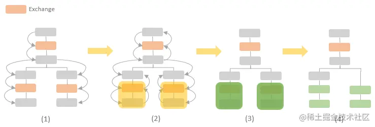As there is no child of the bottom nodes, the allChildStagesMaterialized attribute of the bottom nodes are set as true. On the return journey of the recursive createQueryStages method calls, the parents of the bottom nodes are shuffle Exchange nodes. As the bottom node is not an Exchange node and the allChildStagesMaterialized attribute of the bottom node is true, the bottom node itself can be marked as materialised, therefore the allChildStagesMaterialized attribute of its parent node, the Exchange node, is true as well. Now the condition for creating new QueryStage is met: the current node is an Exchange node and all of its child stages have been materialised. In our example query, the bottom nodes are the file scan nodes for reading the “items” table and the “sales” table. Therefore, two ShuffleQueryStageExec objects are created. After that, the return journey of the recursive createQueryStages method calls continues. However, as those two Exchange nodes are not materialised yet, no query stage will be created for all the ancestor nodes of the Exchange nodes.